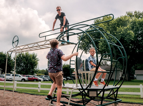 Clockwise from top, Ryker Broughton, Max Christensen and Cían Baldwin play on the helicopter jungle gym at the Morse Bluff park. The playground piece is a memorial to Bud Musiel, who loved to fly.
