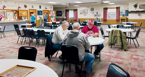 Wednesday, 10 a.m. Darrell Ritenour, Mick Tank, Lon Bohling play a game of cards at the Gathering Place. There are lots of empty chairs that need to be filled to keep the center viable.