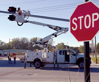 NDOT workers change the blinking light over the Highway 79 and Platte River Road intersection Friday to make it red in all directions. Stop signs were added to Platte River Road to make the intersection a four-way stop. |