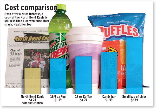 Eagle announced subscription changesby Nathan Arneal This July the Burt County Plaindealer, the newspaper in Tekamah owned by Lee Enterprises, published its final issue and closed up shop. That’s a town of nearly 2,000 people and a county seat without a newspaper. No one covering Tekamah city council. No one reporting on Tekamah-Herman sports, activities or school board. No one telling the interesting stories of the community. That is not going to happen in North Bend. We at the Eagle are all in. We hope that you, our readers and subscribers, come with us. Like everyone everywhere, we at the Eagle have seen our expenses go up. The fact that everything in all walks of life has gotten more expensive has made me gun shy about adding the Eagle to the list of growing expenses. But changes need to be made and we think the Eagle still provides great value, even with an increase in price. The goal of this article is to be transparent in our reasoning for our price increase. It costs us $738.59 every week to print and mail the paper. Last week our printing bill was $398.37 and postage was $295.78. The software we use to produce the paper requires a licensing fee of $192.58 per month, or $44.44 a week (It used to be that you bought a package of software for $1,100 and used it for years. Then Adobe figured out they could make more money by requiring a monthly subscription. Now you reach that $1,100 in matter of months.) The Eagle’s subscription numbers are very close to the highest they’ve been under our ownership, which began in 2006. If you divide out what we get at the current $45 in-state subscription, it comes out to $679.32 a week. If you add in e-subs, which require no printing or mailing, it’s $718.55. In other words, it costs 87 cents to print and distribute a paper to each subscriber while each subscription brings in 85 cents per issue. Staff salaries, computers and camera equipment costs are not figured into that cost. We are currently losing money on subscriptions. Yes, ad revenue keeps us in the black, but we have decided if we are going to stay in business – and we are – we should no longer lose money on subscriptions. As of Nov. 1, a yearly in-state subscription to the Eagle will be $65. That is a significant leap from the current rate of $45, but if you break it down it’s just $5.42 a month. $1.25 a week. 18¢ a day. Isn’t it worth 18¢ a day to support local news? To receive a product that takes hundreds of man hours and thousands of dollars of equipment to assemble? As illustrated by the graph above, an Eagle will still be cheaper than a snack or a cup of coffee. The current business model for newspapers began in 1833. Andrew Jackson was president. The Civil War was still three decades in the future. That’s when the penny press model started, determining news should be dirt cheap. Ever since, newspapers have relied on advertising to stay afloat. Today that model doesn’t work like it used to. Some advertisers think their money is better spent in Mark Zuckerberg’s pockets than the local newspaper. Other digital advertising has crept in. Classified ads have nearly disappeared. However, we think the North Bend Eagle is still the best way to get word about your product, service or event in front of North Bend and Morse Bluff area residents. Let us help you. Our advertising rates will not be increasing anytime soon. The rate for out-of-state subscribers – which carry significantly higher postage rates – will be $75 per year ($1.44 a week. 20.5¢ a day). A full-color e-sub, delivered to your e-mail in-box on Tuesdays, will be $58. You can get both the print and e-edition by adding $12 onto the cost of your print subscription. More than 3,200 U.S. newspapers have closed in the last 20 years, according to Northwestern University’s State of Local News project. The Eagle is not going to be one of them. We are all in. We hope you will be, too, for just 18¢ a day.