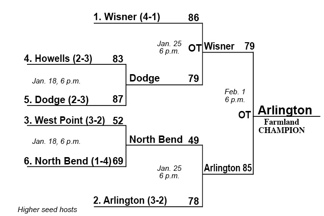 Championship: Wisner kept building leads and Arlington kept meeting the challenge before the Armadillos finally claiming their first Farmland title in overtime. Semifinals: After two upsets in the first round, seeding held true in the semis, with Wisner and Arlington advancing to the finals. Arlington pulled away from a shorthanded North Bend in the second half after a halftime tie while Wisner had to fight off Dodge in overtime. The Armadillos return to the championship game for the second straight year, while the Beef are back in after winning the 2024 title. First round: Both opening playoff games were upsets, with the two bottom seeds, Dodge and North Bend, winning on the road. The Ambush and Gamecocks will take on the top two seeds in the semis this Sunday. Bracket: Wisner earns its fourth straight No. 1 seed in the playoffs, and will be searching for its second championship. Arlington joins them with a first-round bye. The two ties in the final standings were broken by head-to-head results.