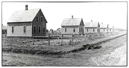 row of newly constructed houses await residents in the newly minted town of Leavitt, Nebraska, in 1899.