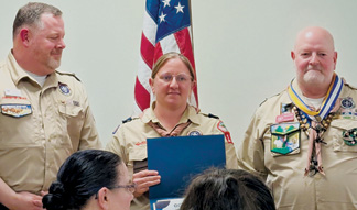 North Bend Pack 110 cubmaster Amy Voss, center, was named the Cubmaster of the Year in the Goldenrod District. |